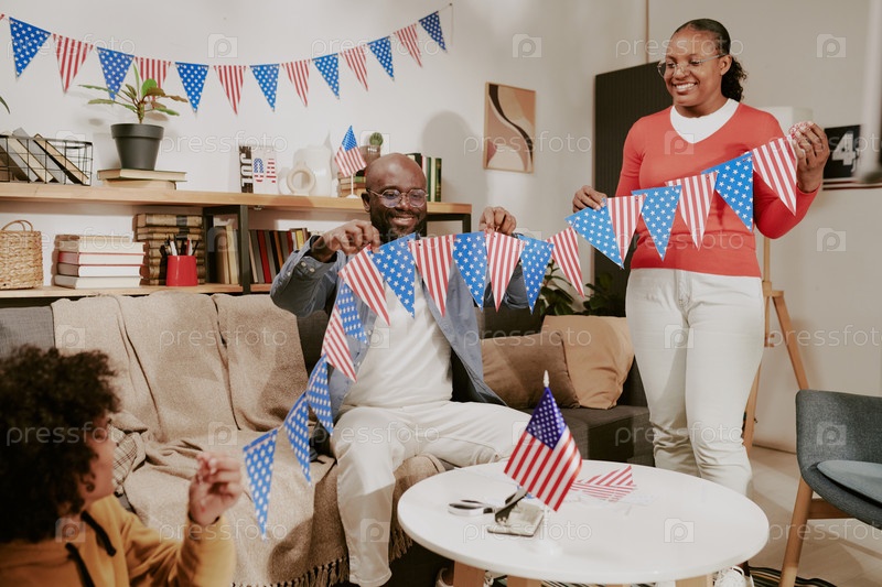 Чернокожий мужчина и женщина средних лет украшают гостиную американскими флагами