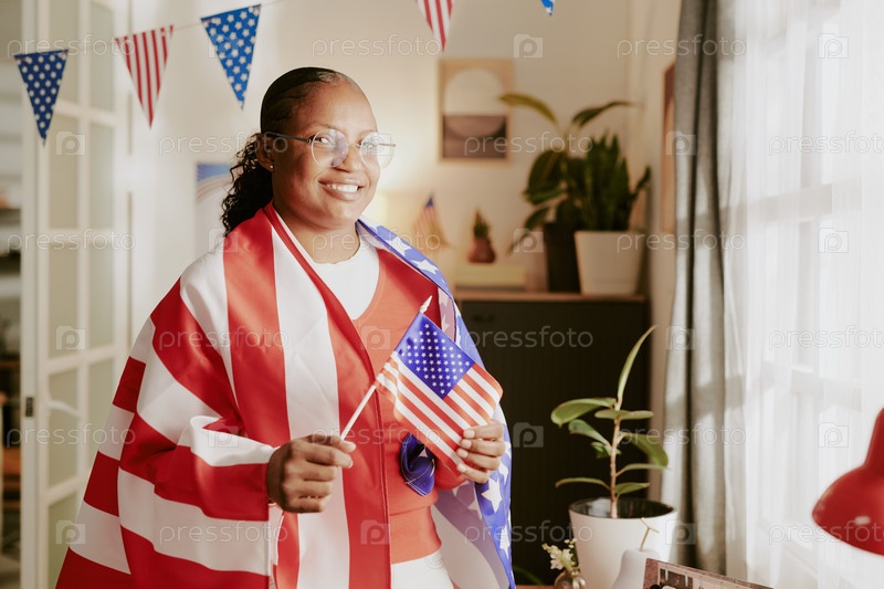 Портрет чернокожей женщины среднего возраста, улыбающейся во время покрытия американским флагом в помещении