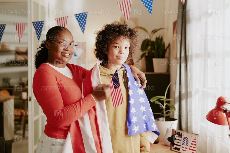 Чернокожая женщина и подросток празднуют День независимости с американским флагом