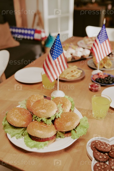 Тарелка гамбургеров с американскими флагами, празднующие День независимости в помещении