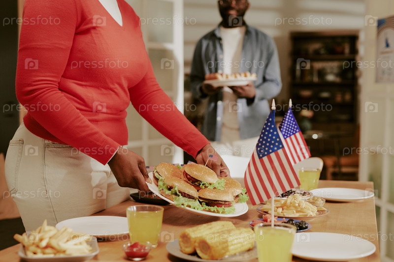 Чернокожая женщина средних лет подает гамбургеры во время патриотического семейного собрания