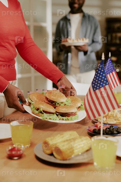 Женщина, подающая гамбургеры во время праздничного собрания с американскими флагами