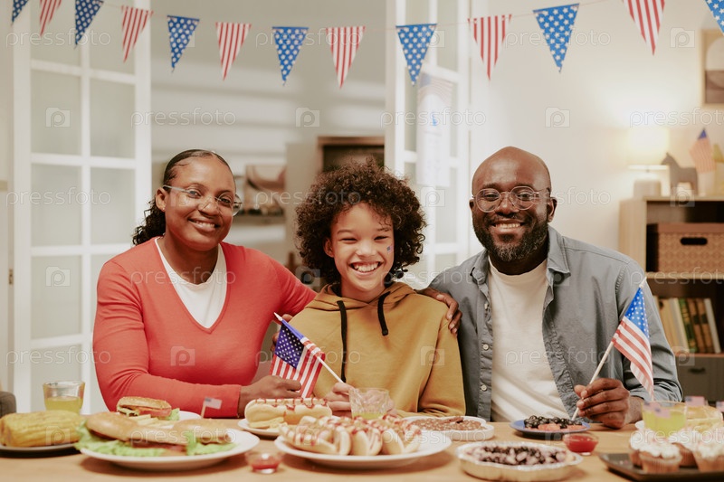 Американская семья празднует День независимости с праздничной трапезой в помещении