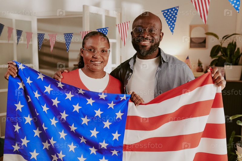 Портрет чернокожей пары среднего возраста, улыбающейся и держащей американский флаг в помещении