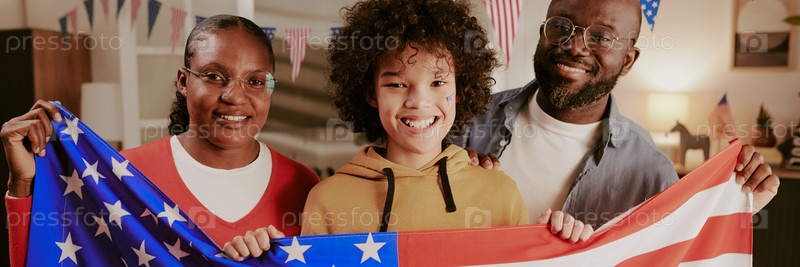 Глава чернокожей семьи улыбается и держит американский флаг в помещении вместе
