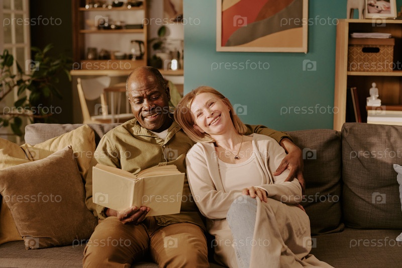 Пожилая мультиэтническая пара отдыхает вместе на диване и улыбается дома
