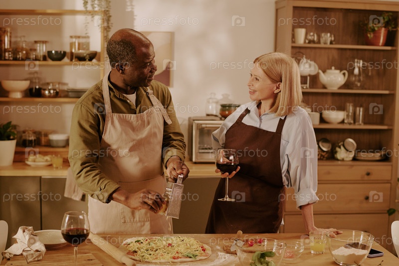 Старшая женщина и старший чернокожий мужчина гребят сыр и делятся вином