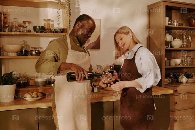 Мультиэтническая старшая пара улыбается, наливая вместе вино на кухне