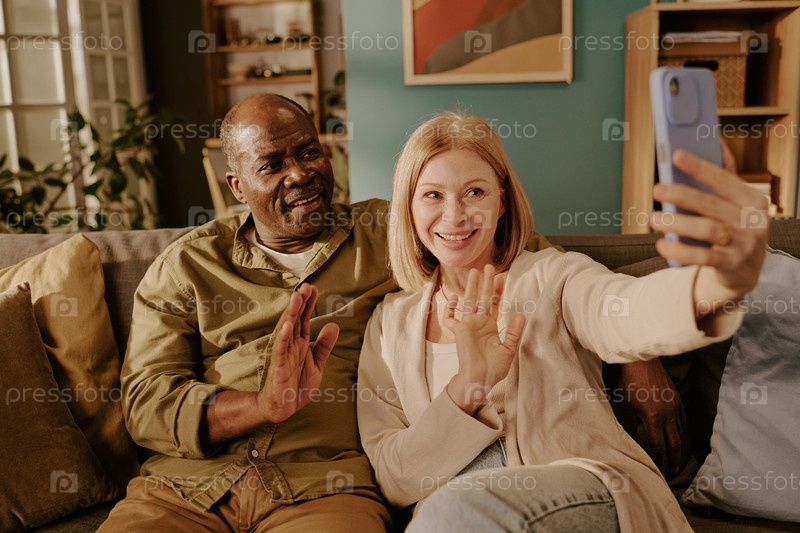 Старшая женщина и старший чернокожий мужчина улыбаются и машут во время видеозвонка