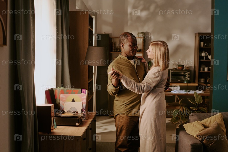 Мультиэтническая старшая пара танцует вместе и делится романтическими моментами в помещении