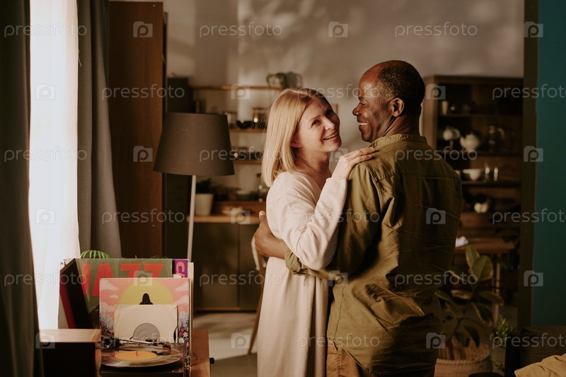 Старшая женщина и старший чернокожий мужчина танцуют вместе и улыбаются в помещении