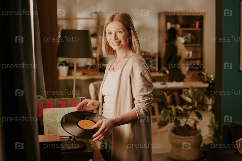 Старшая женщина улыбается, играя на виниловой пластинке в уютной гостиной