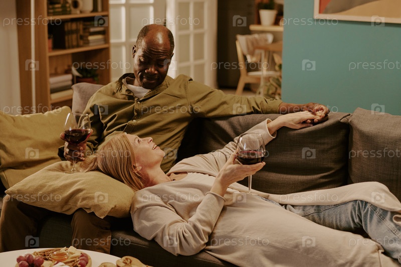 Старшая мультиэтническая пара отдыхает вместе на диване и наслаждается вином