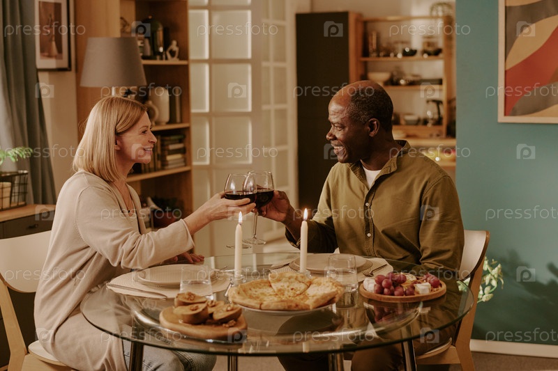 Старшая женщина и старший чернокожий мужчина наслаждаются романтическим ужином вместе
