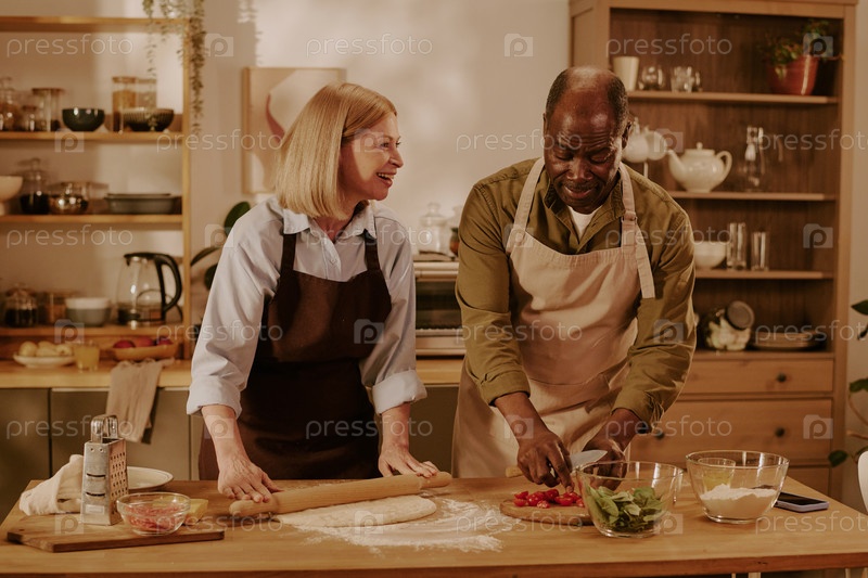 Старшая женщина и старший чернокожий мужчина готовят еду вместе на кухне
