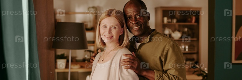 Старшая женщина и старший чернокожий мужчина обнимаются и улыбаются в помещении