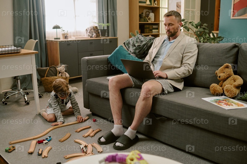 Мужчина средних лет работает удаленно, в то время как ребенок играет на полу поблизости
