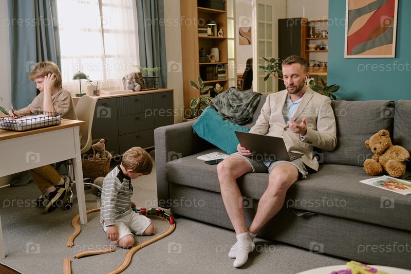 Мужчина средних лет работает удаленно, в то время как дети играют поблизости