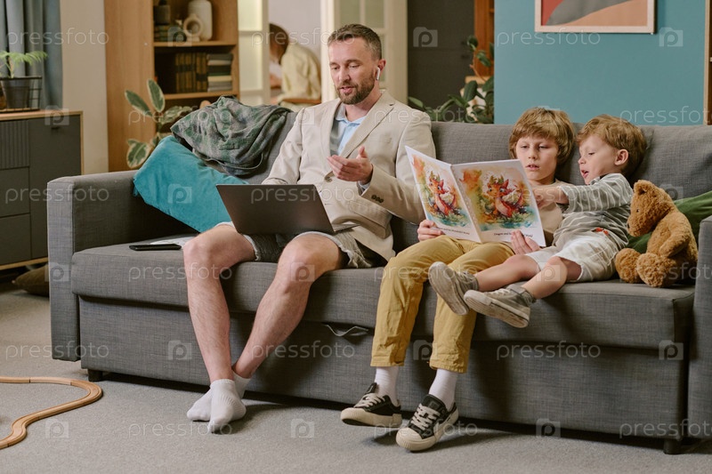 Мужчина средних лет работает удаленно, в то время как сыновья читают рассказ