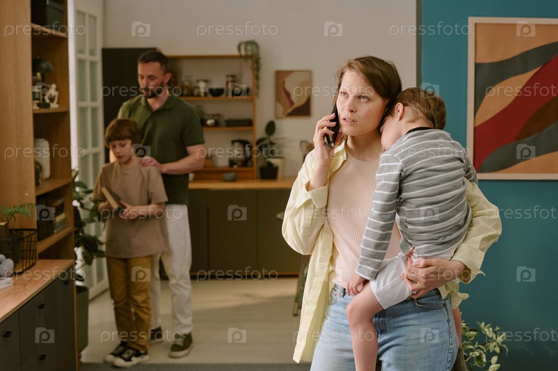 Молодая мать держит ребенка, разговаривая по телефону Работает из дома