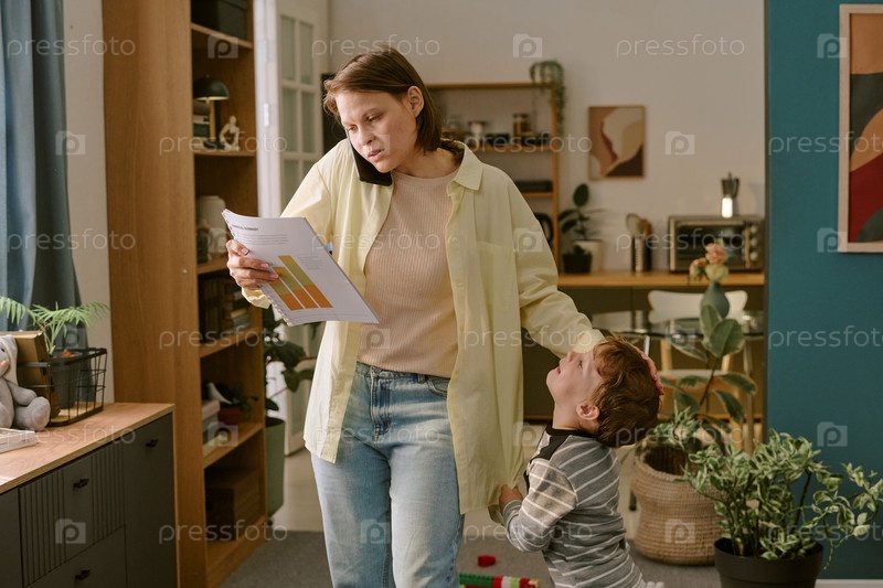 Молодая взрослая женщина работает удаленно, заботясь о маленьком ребенке