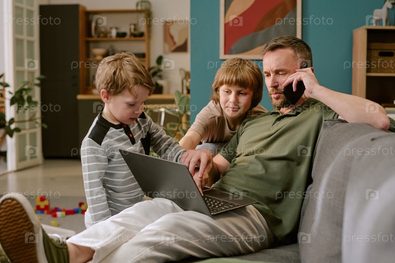 Мужчина средних лет работает удаленно, взаимодействуя с детьми