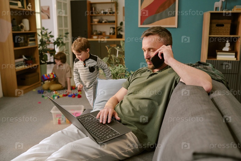 Мужчина среднего возраста работает удаленно, наблюдая за играми детей