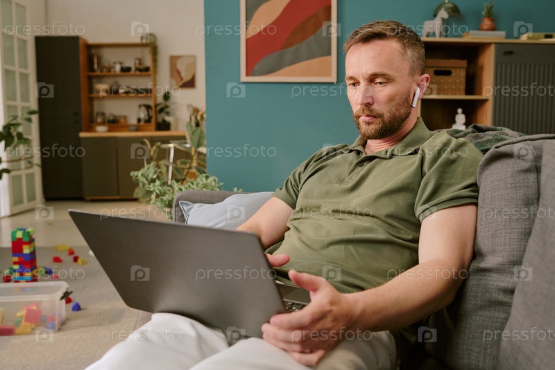 Мужчина средних лет работает удаленно, используя ноутбук на диване дома