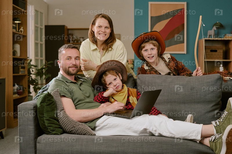 Семья, работающая удаленно с детьми, играющими в гостиной