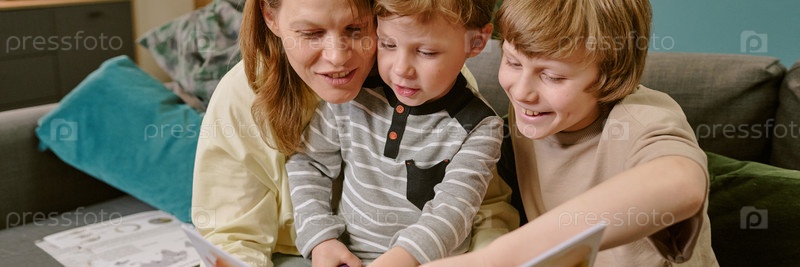 Мать помогает двум маленьким сыновьям читать вместе, работая из дома