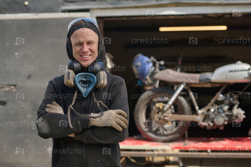 Молодой взрослый мужчина улыбается, собирая мотоцикл в мастерской