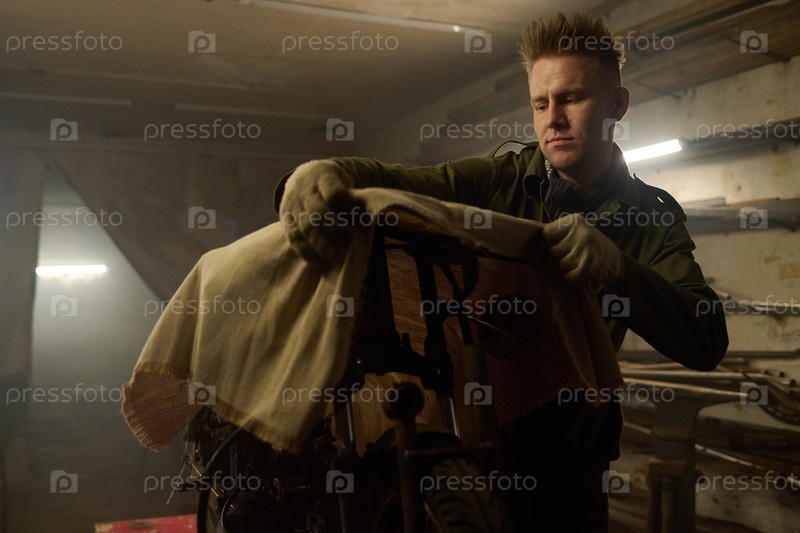 Молодой взрослый мужчина собирает пользовательский велосипед в мастерской Гаражная установка