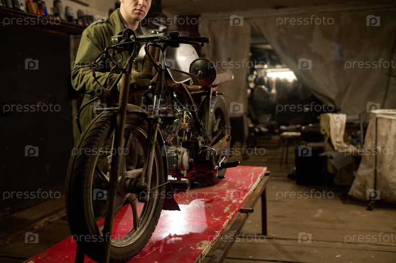 Молодой человек, ремонтирующий пользовательский мотоцикл в мастерской гаража Young Man Repairing Custom Motorcycle in Workshop Garage Setting