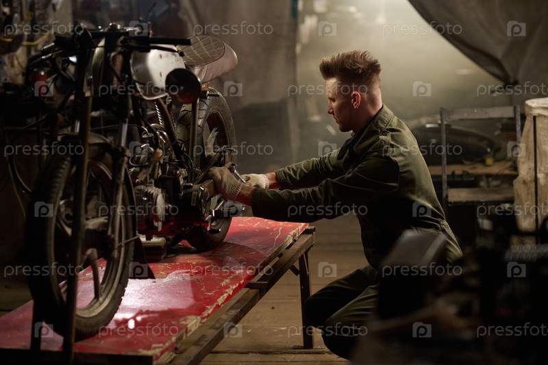 Молодой взрослый мужчина ремонтирует пользовательский мотоцикл в условиях мастерской