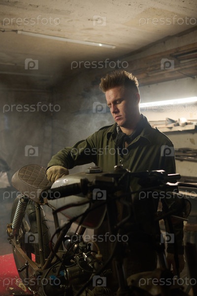 Молодой взрослый мужчина регулирует мотоциклетные детали в дымящейся среде мастерской