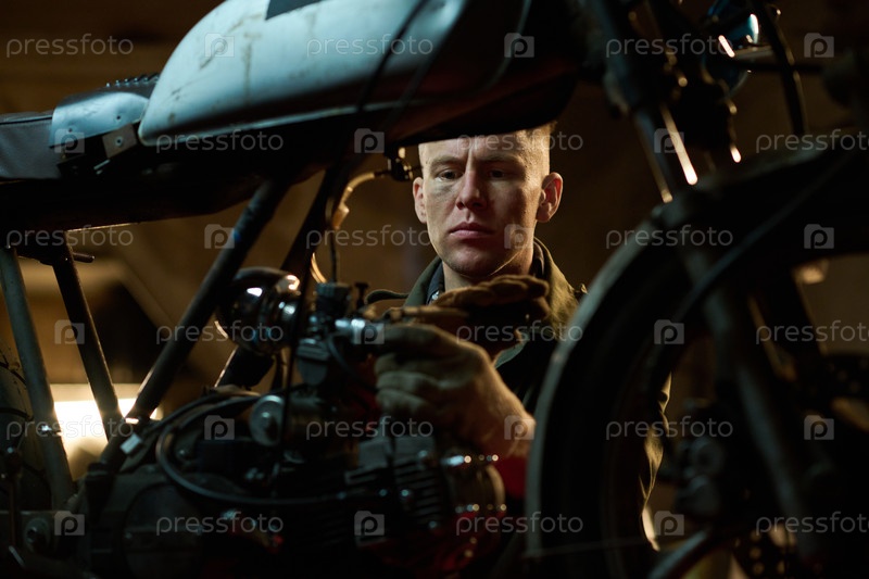 Молодой взрослый человек осматривает компоненты мотоциклетного двигателя в мастерской