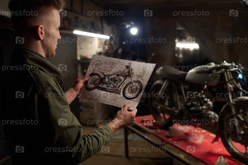 Молодой взрослый мужчина изучает планы дизайна мотоциклов на заказ в мастерской