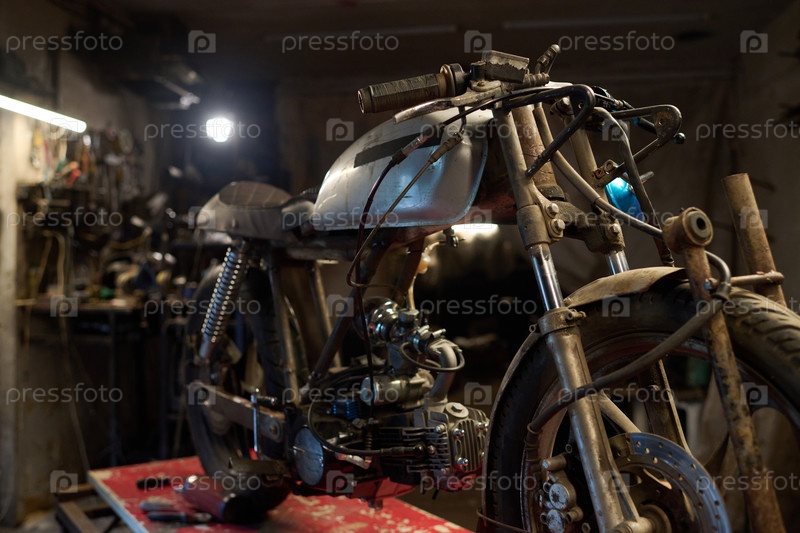 Молодой взрослый мужчина строит пользовательский мотоцикл в домашней мастерской