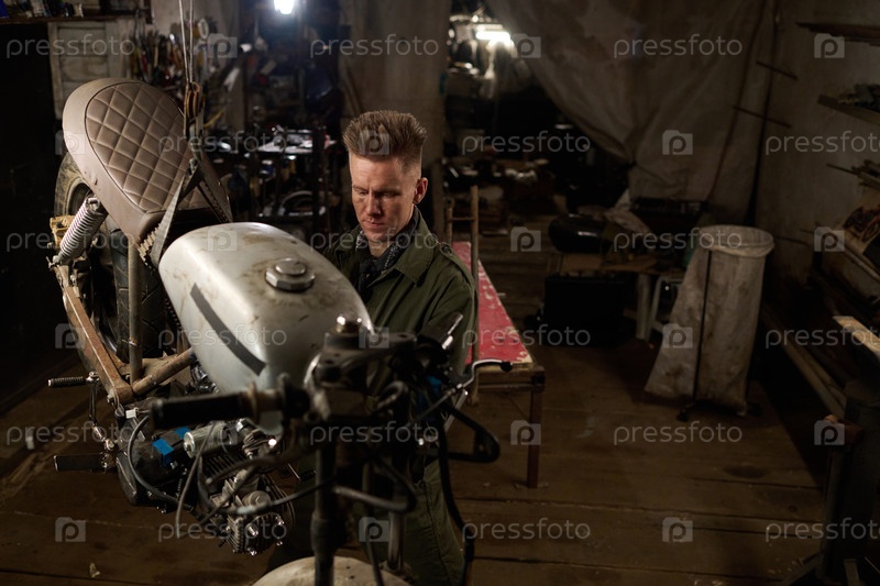 Молодой взрослый мужчина калибровывает рулевые панели на обычном мотоцикле в помещении