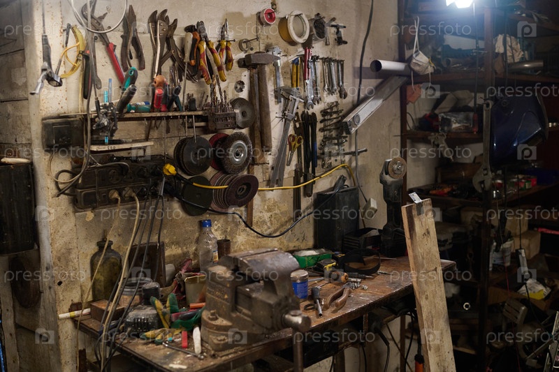 Мужчина средних лет ремонтирует велосипед в мастерской, окруженный инструментами
