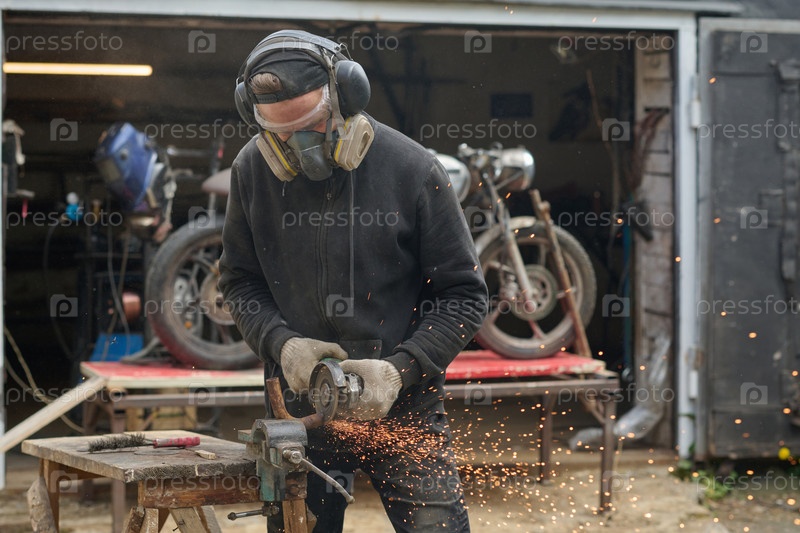 Молодой взрослый мужчина шлифовал металл во время ремонта мотоцикла