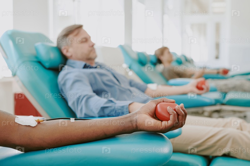 Мультиэтнические взрослые сдают кровь в медицинском центре Кресла для донорства крови