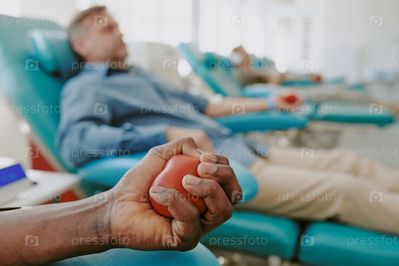 Чернокожий мужчина средних лет сдает кровь в клинике с другими донорами на заднем плане