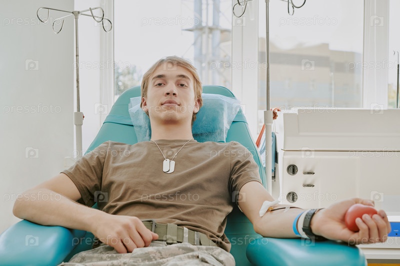 Портрет молодого взрослого мужчины, сдающего кровь в медицинском учреждении
