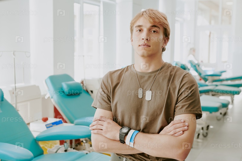Портрет молодого взрослого мужчины, стоящего в центре донорства крови