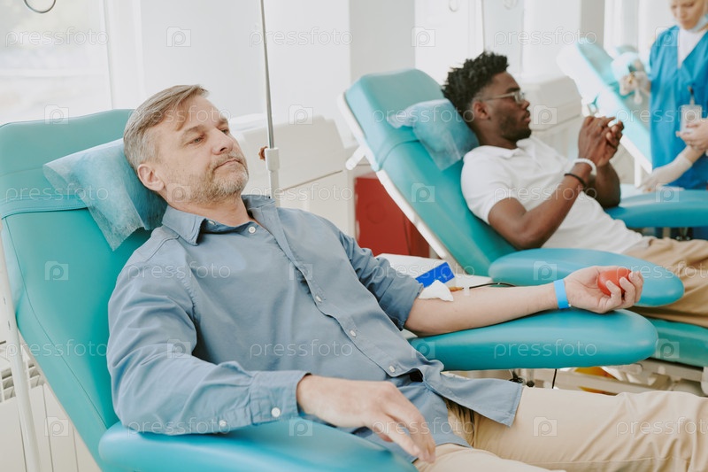 Мужчина среднего возраста и молодой чернокожий человек сдают кровь в клинике