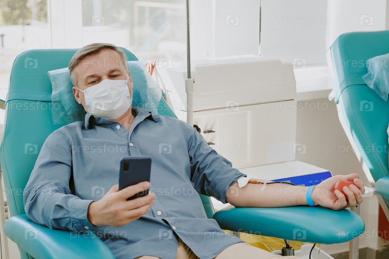 Мужчина средних лет сдает кровь, используя смартфон в клинике
