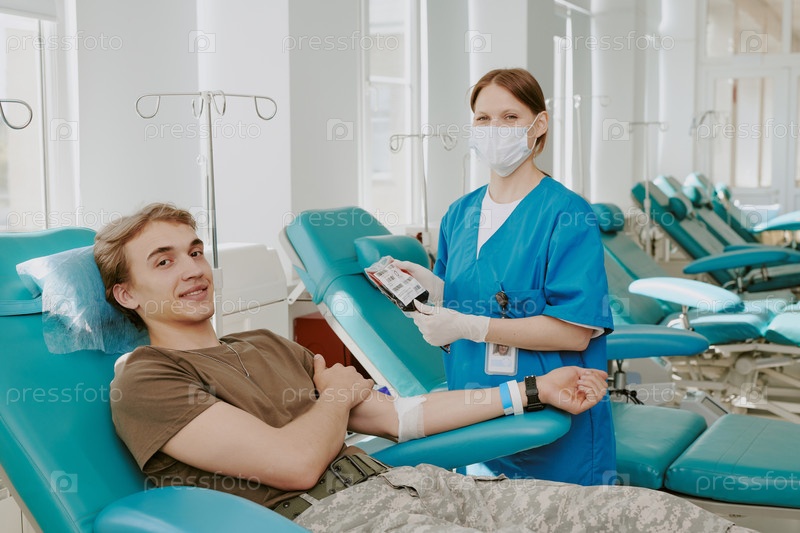 Молодой человек сдает кровь вместе с медсестрой, помогающей в клинике