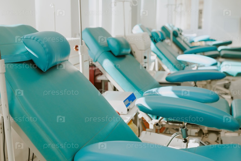 Пустые стулья для сдачи крови ждут доноров в медицинской клинике