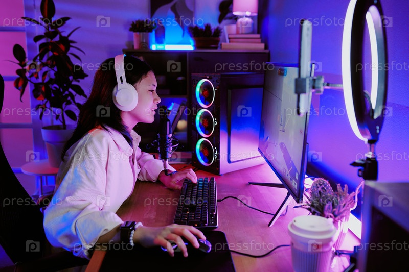 Подростковая девушка живая трансляция видеоигр с наушниками и микрофоном